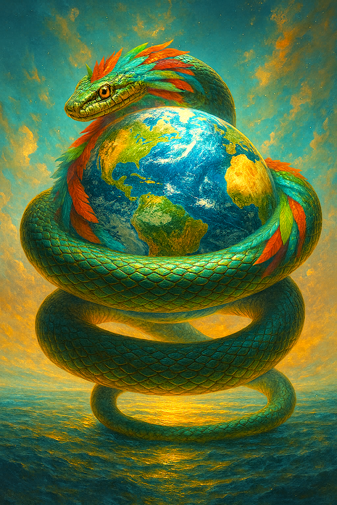 These three Toltec worlds, like the Andean ones, are not separate locations but interpenetrating states of awareness within Teotl—the living, self-generating energy that creates and dissolves all form. In the Toltec tradition, the Feathered Serpent, Quetzalcoatl, moves through all three—shedding in Mictlan, walking in Tlalticpac, and flying in Ilhuicac—the embodiment of liquid consciousness awakening to itself.